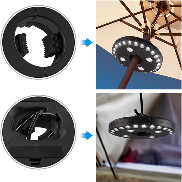 Na rozdíl od standardních světel na deštníky funguje BRELLAGLO tam, kde ho potřebujete. Připevněte ho na deštník pro osvětlení terasy nebo použijte vestavěné háčky k zavěšení—ideální pro kempování a venkovní dobrodružství.